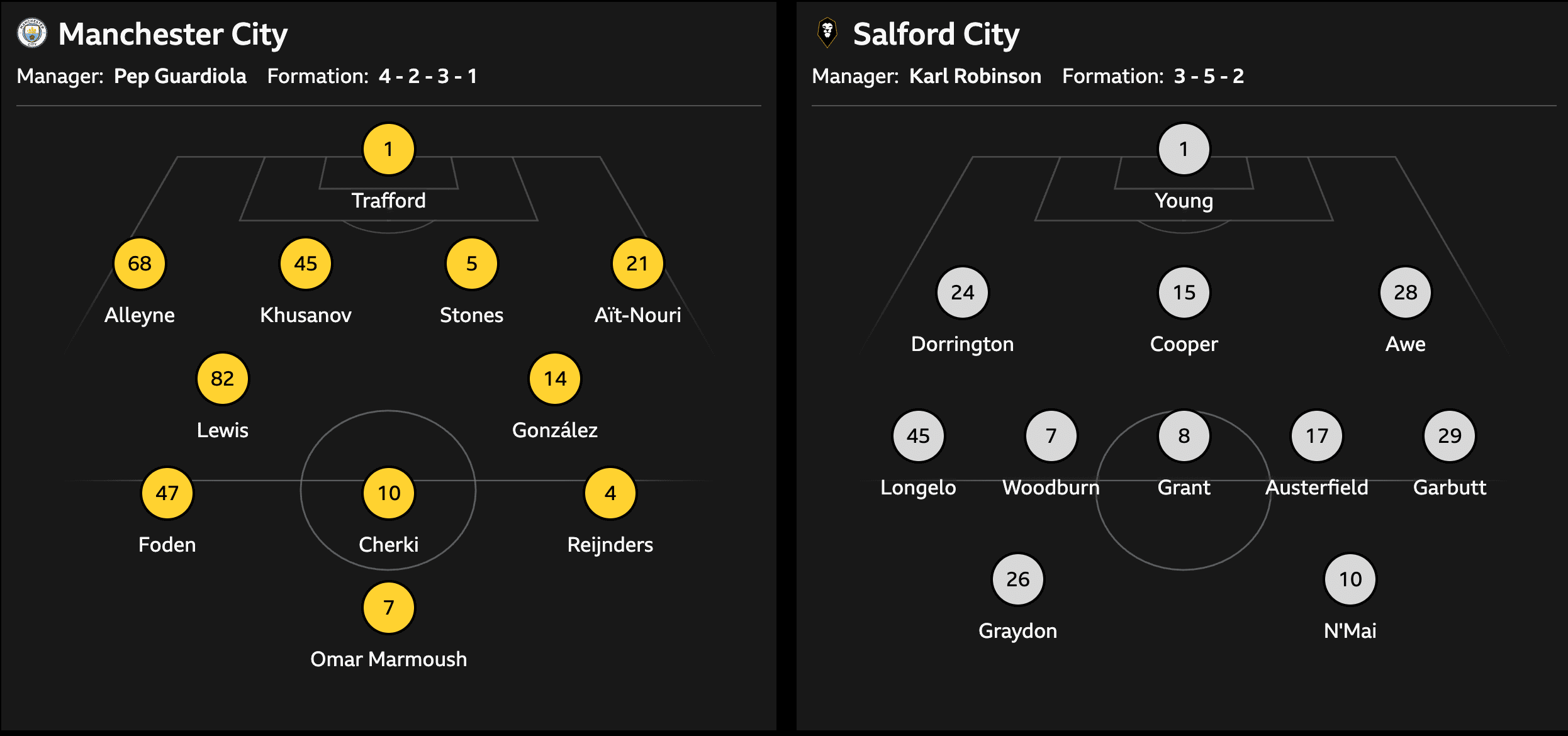 Manchester City confirmed their squad ahead of the match against Salford City, which featured players such as Stones and Foden. Salford named their own lineup, including Young and Garbutt. The game is set for later this week, sparking anticipation among fans for the upcoming encounter.